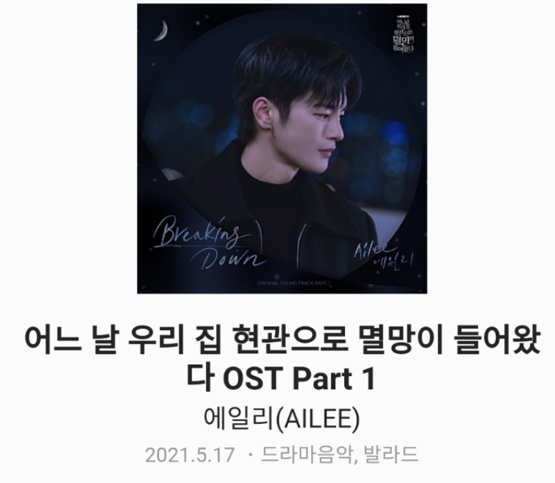 어느 날 우리집 현관으로 멸망이 들어왔다 OST. 에일리가 부른 Breaking Down 브레이킹 다운이에요.노래도 꼭 들어보세요! 들어보시면 알겠지만, 에일리님은 노래 정말 잘하죠! 드라마야 뭐 좋기는 하지만, 그 인기 비결에 노래도 한 몫 하는것 같아요. 저는 한때 노래에 빠져 계속 들었다는 사실 ㅎ