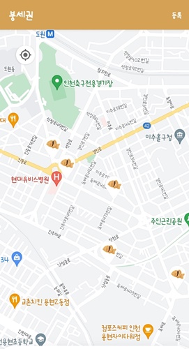 붕어빵 파는 곳을 등록하고 싶다면, 어플 상단 화면 오른쪽에 '등록'을 선택해 줍니다. 위치를 잡아준 후, 간식을 선택하고, 상호와 정보 등을 입력한 후 '상호등록'을 누르면 완료됩니다.