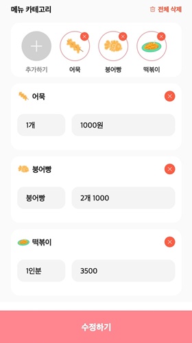메뉴는 붕어빵 외에도 다른 다양한 메뉴들을 선택할 수 있습니다. 호떡, 문어빵, 어묵, 떡볶이, 국화빵 등등 겨울 간식거리들을 등록할 수 있고, 그 외에도 식사거리도 등록 할 수 있습니다.
