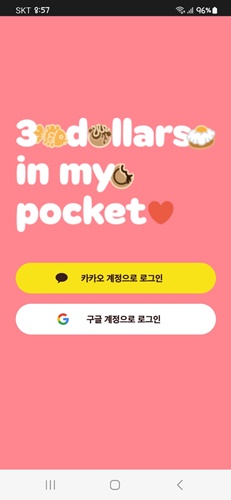 가슴속3천원 어플을 사용하려면 카카오 또는 구글 계정으로 로그인해야 합니다. 로그인을 한 후 개인정보 및 등등에 대해 동의를 하고, 닉네임을 설정한 후 시작할 수 있습니다.
