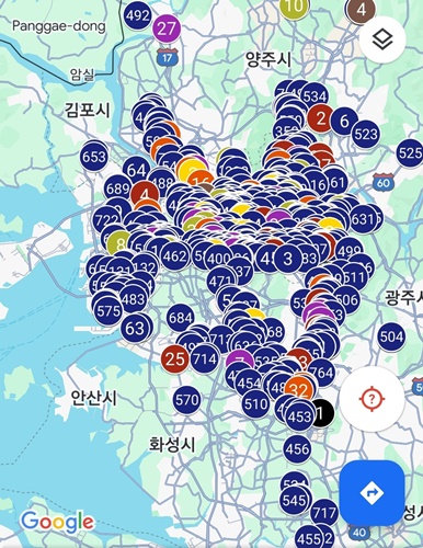 그런데 잘 보시면 동그라미마다 색이 다르고, 숫자도 다릅니다. 이게 뭘 의미하는지 찾아보니, 아래와 같았습니다. 판매하는 간식 종류별로 색을 다르고 했고, 숫자는 등록되는 가게들 순서대로 숫자로 표시한 것 같습니다.