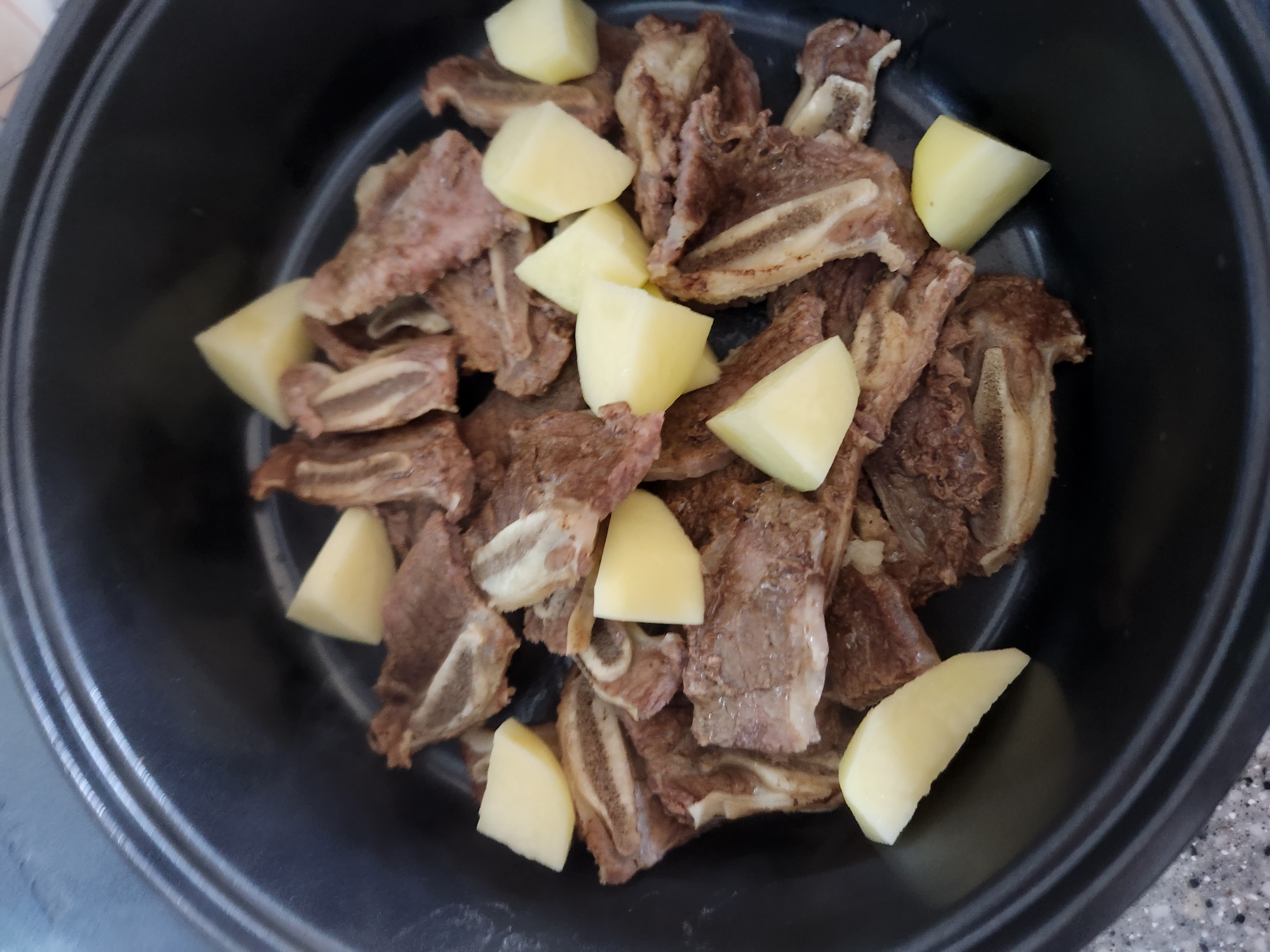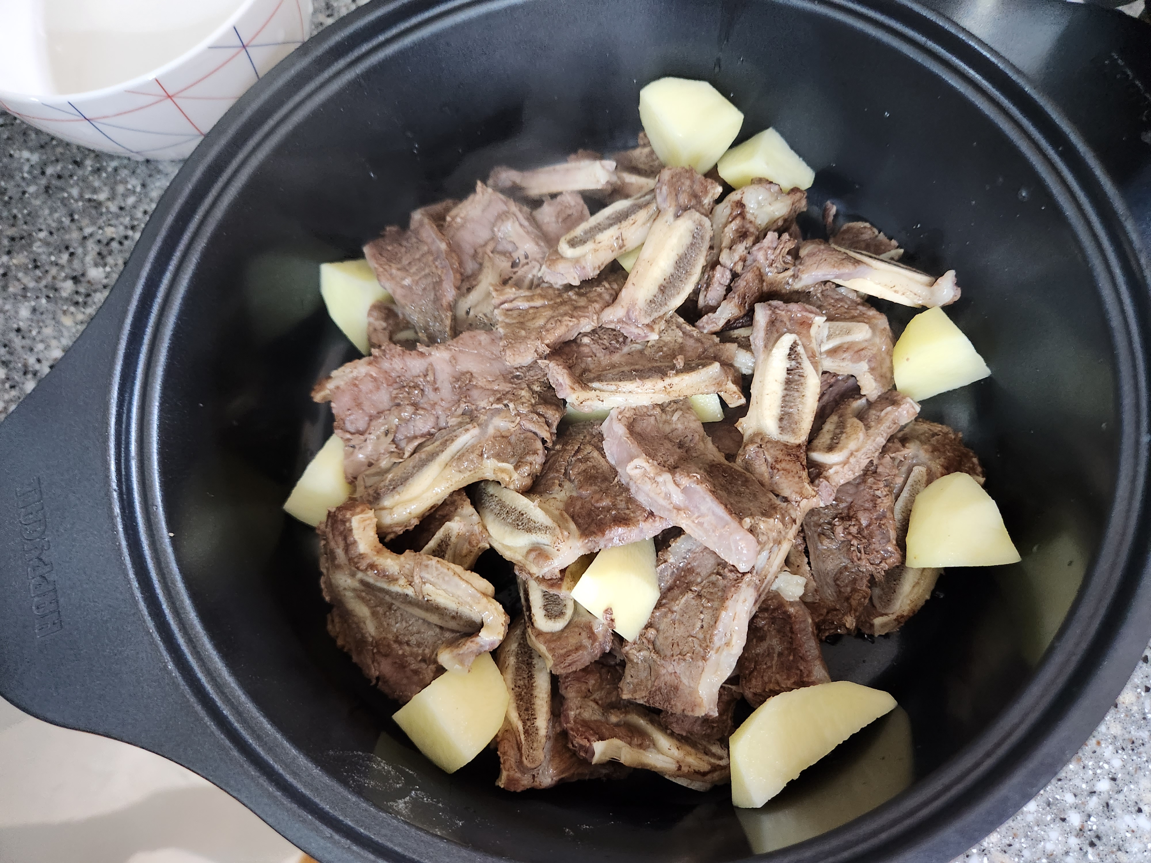 갈비를 압력밥솥에 넣고, 물은 100미리 정도 넣고, 뚜껑을 덮어주세요.