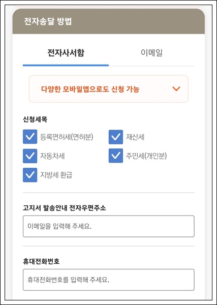 위택스 어플 실행 → 메뉴 → 부가서비스 → 고지서 전자송달 →신청