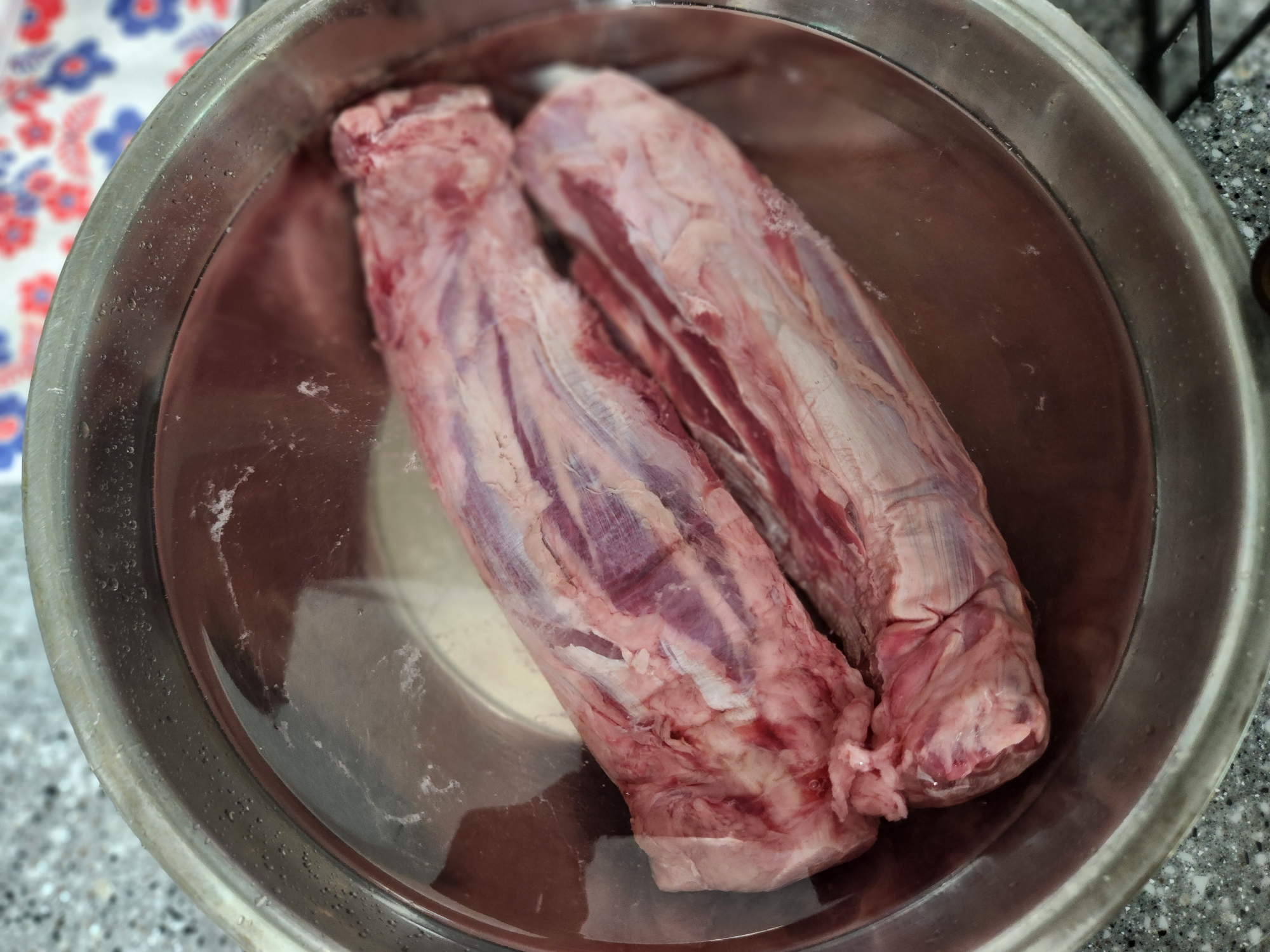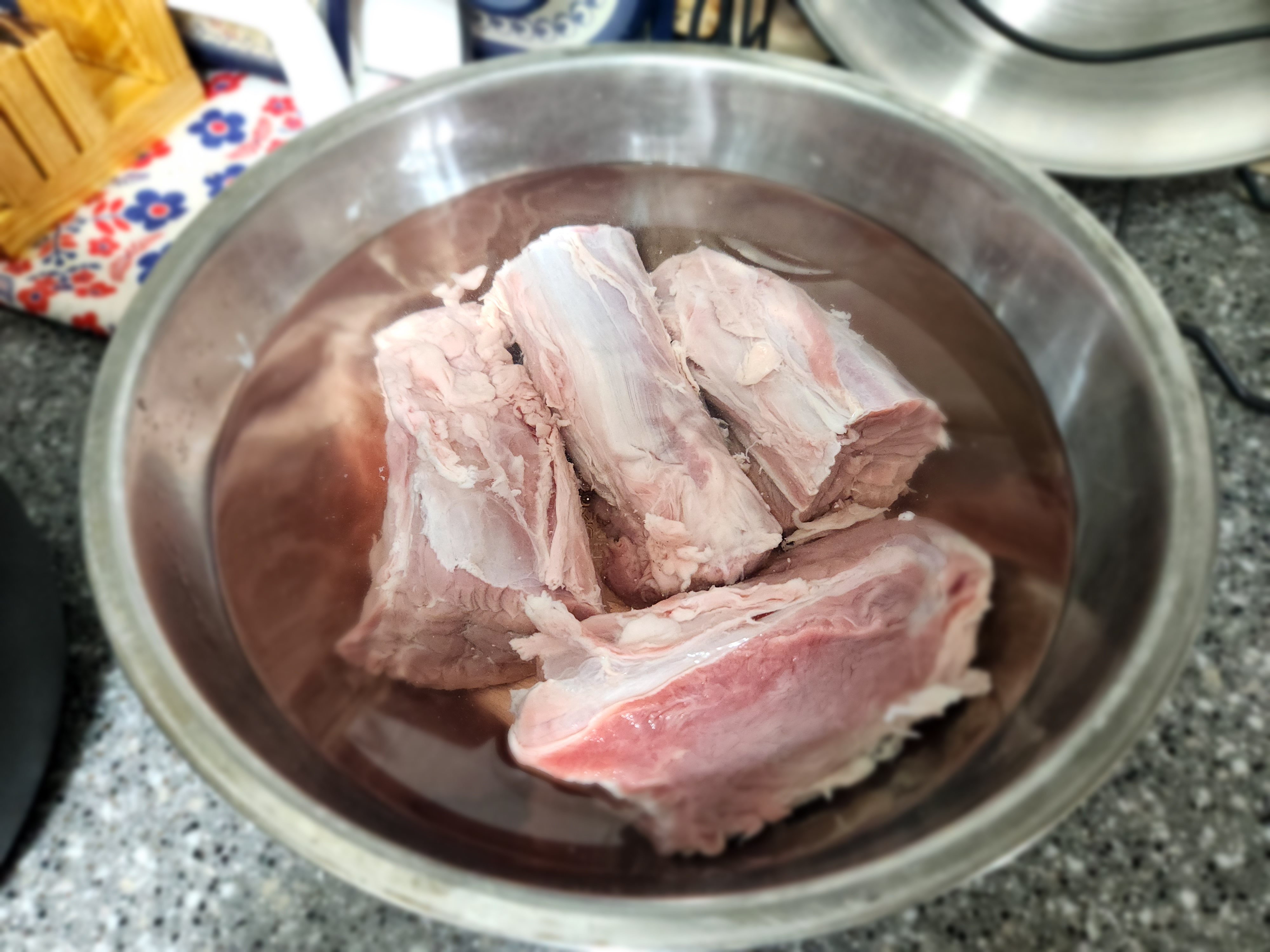 아롱사태는 물에 2~3시간 정도 담가놓았습니다.