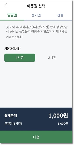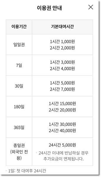 이용권 안내 (1일 기준 : 첫 대여 후 24시간)