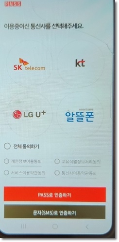 이용 중인 통신사 선택하고, 동의하기 ⇨ 문자 또는 PASS로 인증하기