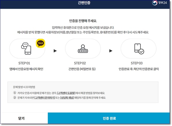 참고로 정부24에 로그인하지 않아도 됩니다. 다만, 정보 확인을 위해 '개인 인증서'가 필요합니다. 개인 인증서로는 간편인증, 공동인증서, 금융인증서 등이 있습니다. 간편인증으로 진행해 보겠습니다.