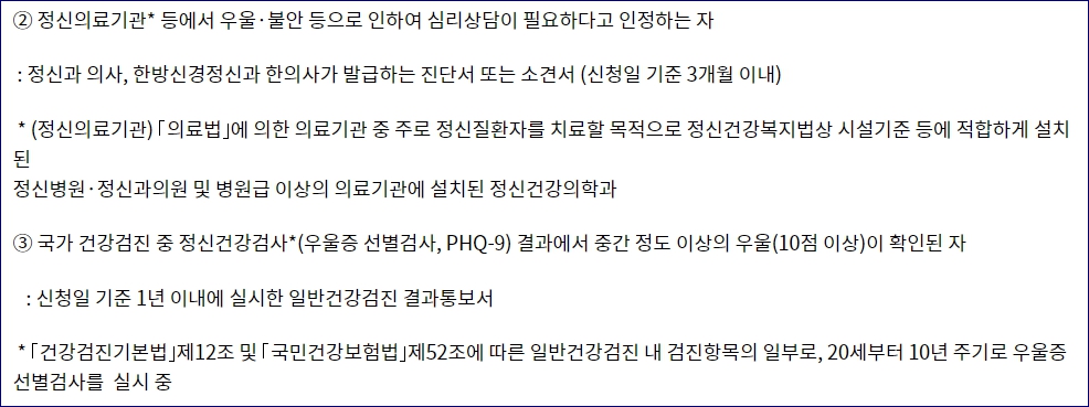 - 정신의료기관 등에서 우울 및 불안 등으로 인해 심리상담이 필요하다과 인정하는 자 ▶ 정신건강의학과 의사, 한방신경정신과 한의사가 발급한 진단서 또는 소견서(신청일 기준 3개월 이내의 것)