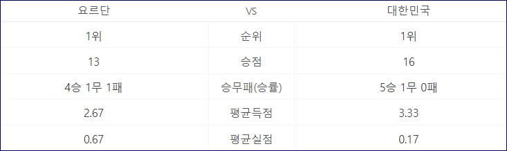 ▪ 경기 기록 (승-무-패) : 요르단은 4승 1무 1패를 기록했고, 대한민국은 5승 1무로 패배가 없었습니다.