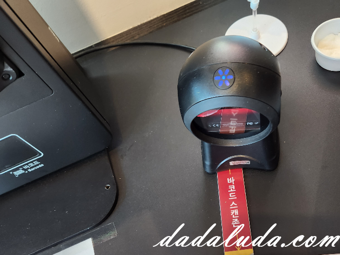 바코드 스캐너에 제품 윗면의 바코드를 갖다 대면 띡 스캔이 돼요.