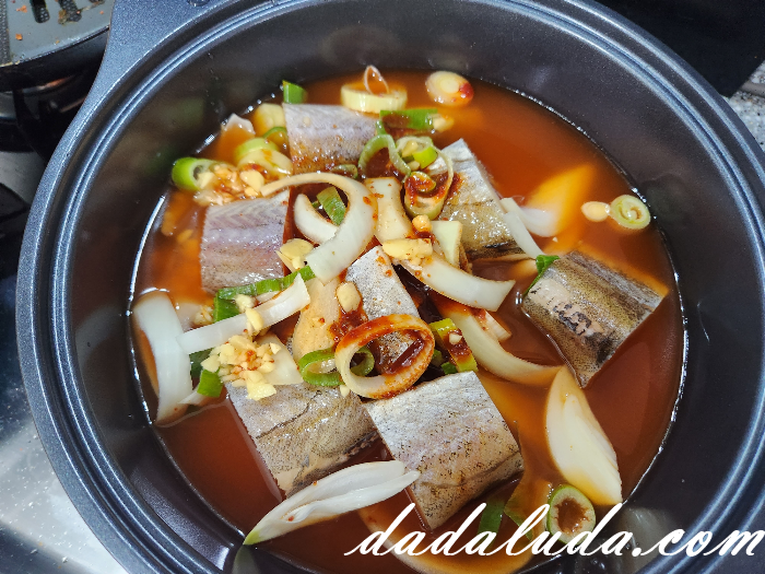 소스와 코다리를 넣어줍니다. 물은 400미리 넣고, 다진 마늘도 넣어주세요.