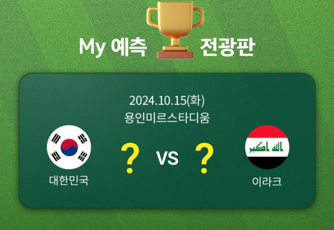 여러분의 열정과 축구에 대한 사랑이 느껴지는 이번 스코어 맞히기 이벤트에 많은 참여 부탁드립니다. 경기 결과를 예측하면서 동시에 멋진 상품도 얻을 수 있는 절호의 기회를 놓치지 마세요. 대한민국과 이라크의 경기를 더욱 기대하며, 팬 여러분 모두가 승자가 되는 그날을 기대합니다. 행운을 빕니다, 그리고 멋진 경기가 될 수 있도록 많은 응원 부탁드립니다!