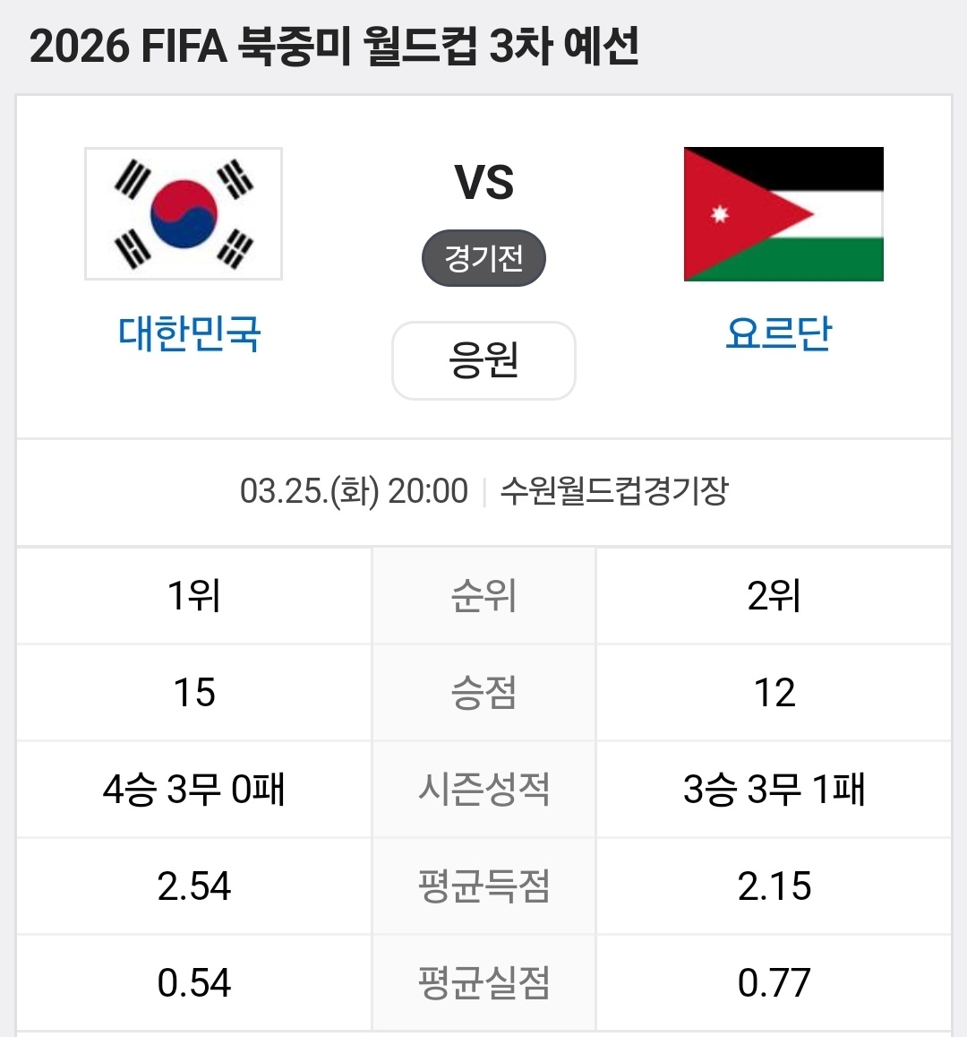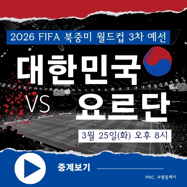 한국 축구대표팀은 3월 25일(월) 오후 8시, 수원월드컵경기장에서 요르단과 2026 북중미 월드컵 아시아 3차 예선 8차전을 치른다. 현재 B조 1위(승점 15)인 한국은 이번 경기에서 승리 시 본선 진출 가능성을 높일 수 있다. 지난 오만전은 1-1 무승부.