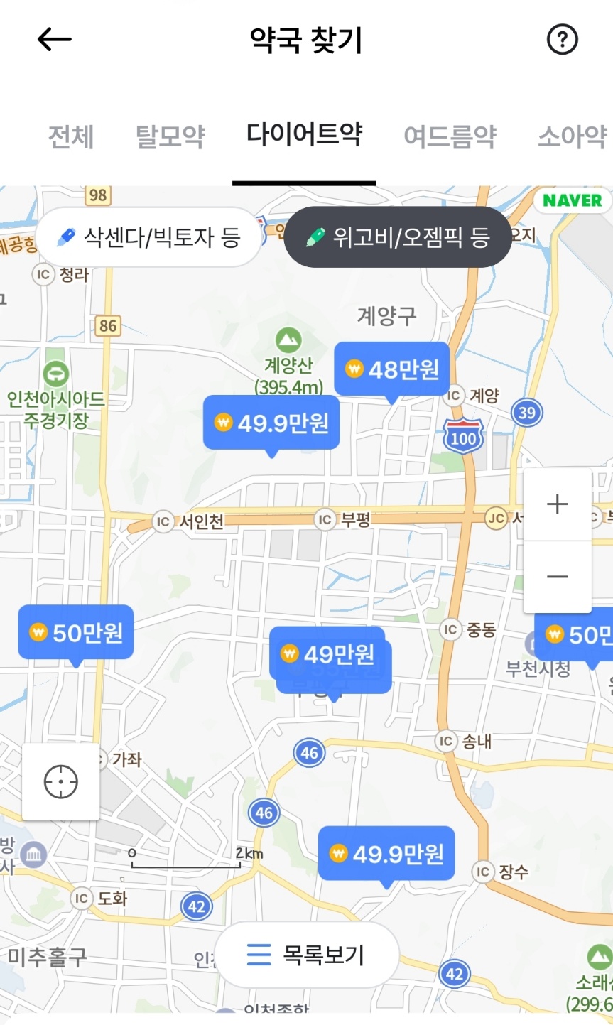 메인화면 ⇨ 약국찾기 ⇨ 위고비/오젬픽 등 선택 ⇨ 지도설정