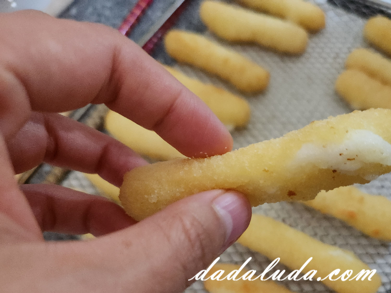 에어프라이어로 구운 치즈스틱을 만져보면 말랑말랑합니다.