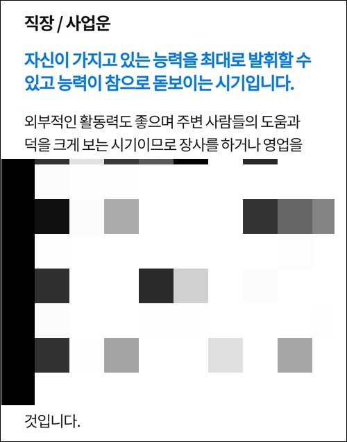 그달의 운세 총론과 그달의 일자별 운세를 볼 수 있습니다. 또한 그달의 재물운, 애정운, 취업/승진운, 이사운 등을 일자별로 알려주어, 이것 또한 보는 재미가 있습니다. 그저 참고용으로만 생각하면 좋을것 같습니다.
