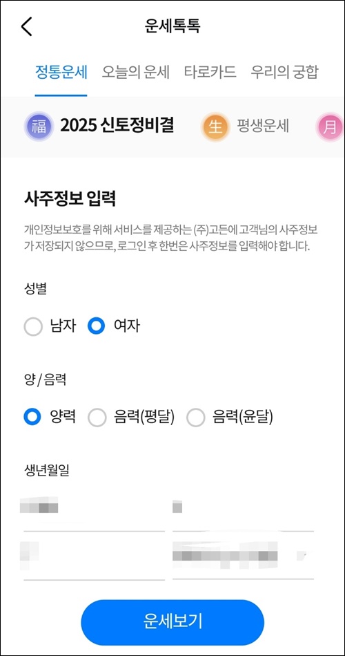 2025 신년운세 삼성생명에서는 2025 토정비결을 볼 수 있습니다. 사주정보를 입력한후 운세보기를 눌러줍니다. 총론, 재물운, 직장/사업운, 가정/건강운, 이성 및 대인관계, 월별 운세등을 볼 수 있습니다.