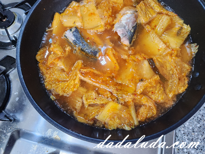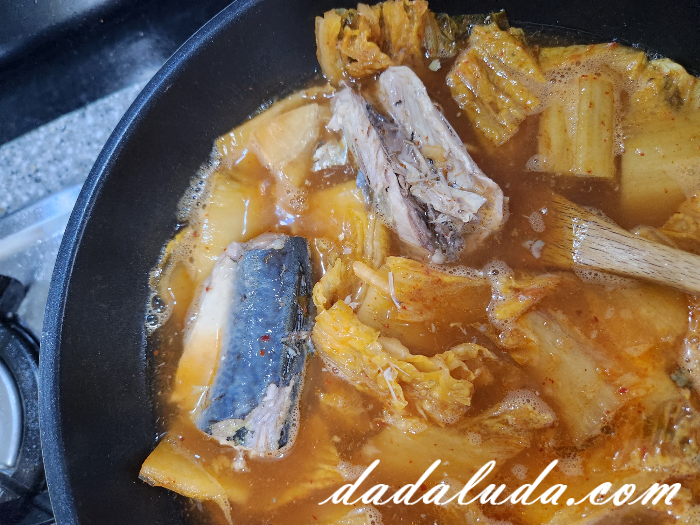 김치찌개의 성공은 맛있는 김치가 좌우한다...라고 저는 생각합니다. 물을 넣고, 쉰김치를 넣고, 김치 국물도 넣어줬습니다. 그리고 동원 자연산 고등어통조림도 넣어줍니다. 통조림 크기가 커 보였으나, 고등어는 두 덩어리가 들어있었습니다. 생각보다 적은 양에 살짝 실망도 했습니다. 그래도 맛만 있으면 괜찮을 것 같습니다.