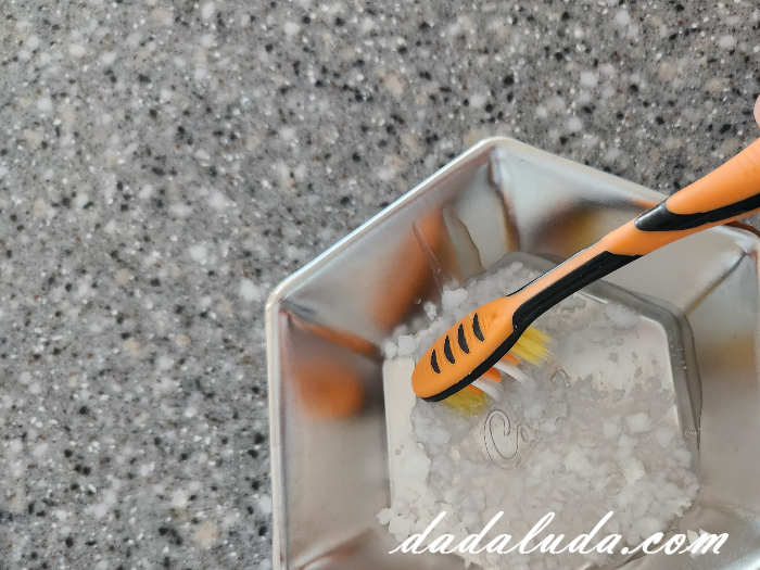 소금위에 샴푸를 한 펌프, 두 펌프 정도 넣어줍니다. 그리고 안 쓰는 칫솔로 막 섞어줍니다.