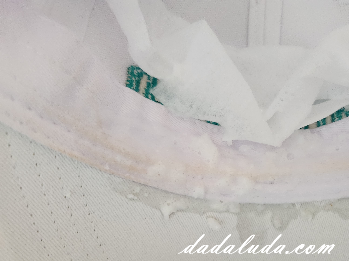 계속 섞어주다보면 소금이 점점 녹습니다. 어느 정도 걸쭉해졌다면 다 된 것입니다. 굳이 소금이 다 녹을 때까지 섞어주지 않아도 됩니다. 이제 이것으로 모자에 묻은 화장품 지우기를 해봅니다. 모자에 묻은 화장품 위에 이 액을 올려주세요. 그리고 칫솔로 막 문질러 줍니다.