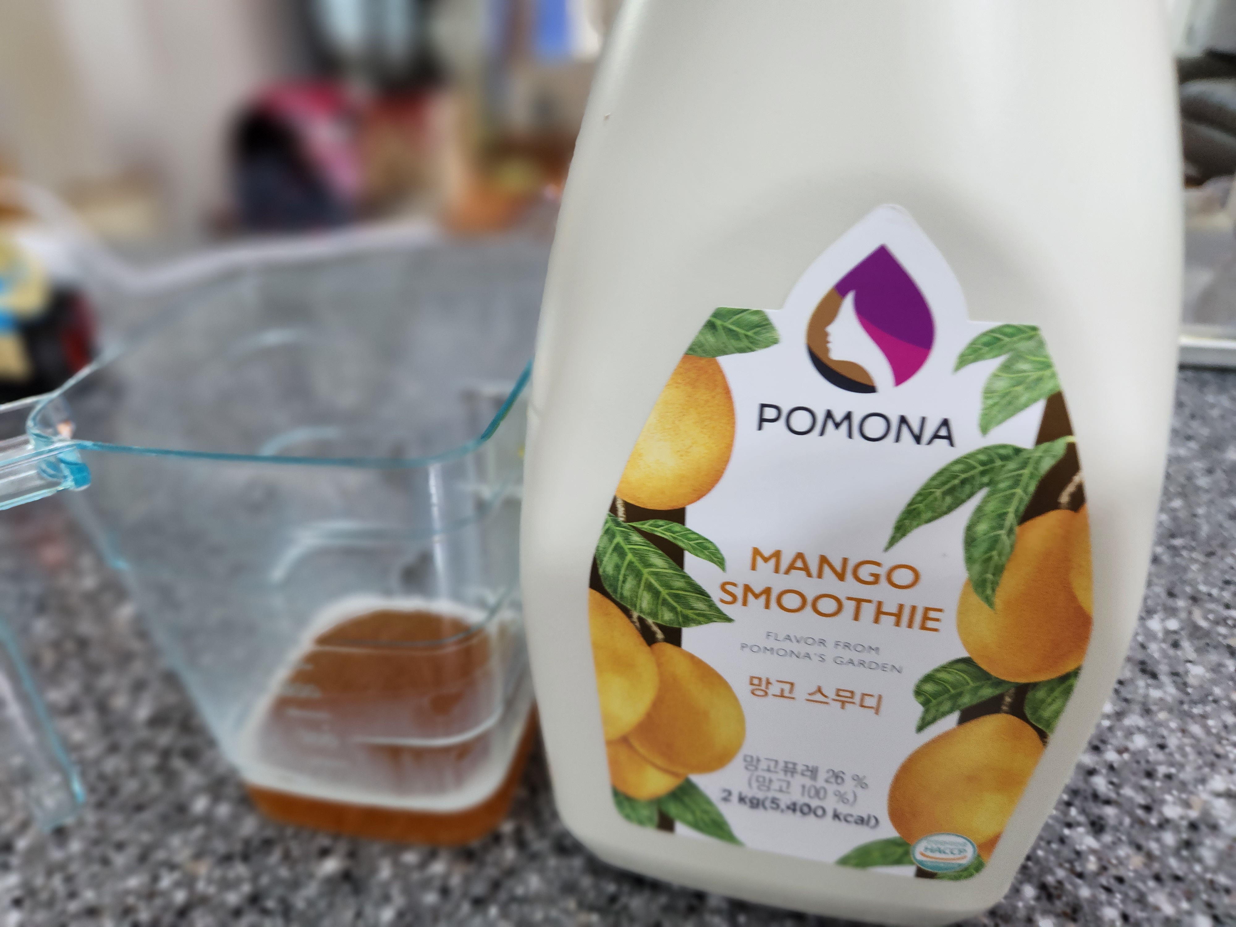 그다음으로는 망고스무디 시럽을 준비합니다. 제가 준비한 망고스무디 시럽은 포모나 망고스무디 시럽입니다. 망고의 과즙을 담아 넣은 망고시럽입니다. 먹어보니 포모나 망고스무디 시럽은 맛이 인위적이지않아 좋습니다. 이 망고스무디 시럽으로는 망고스무디 외에도 망고 블라스트, 망고 크러쉬, 망고허니라떼, 망고빙수, 망고차 등등 다양하게 활용할수 있습니다. 우유를 넣은 믹서기에 망고스무디 시럽도 넣어줍니다.