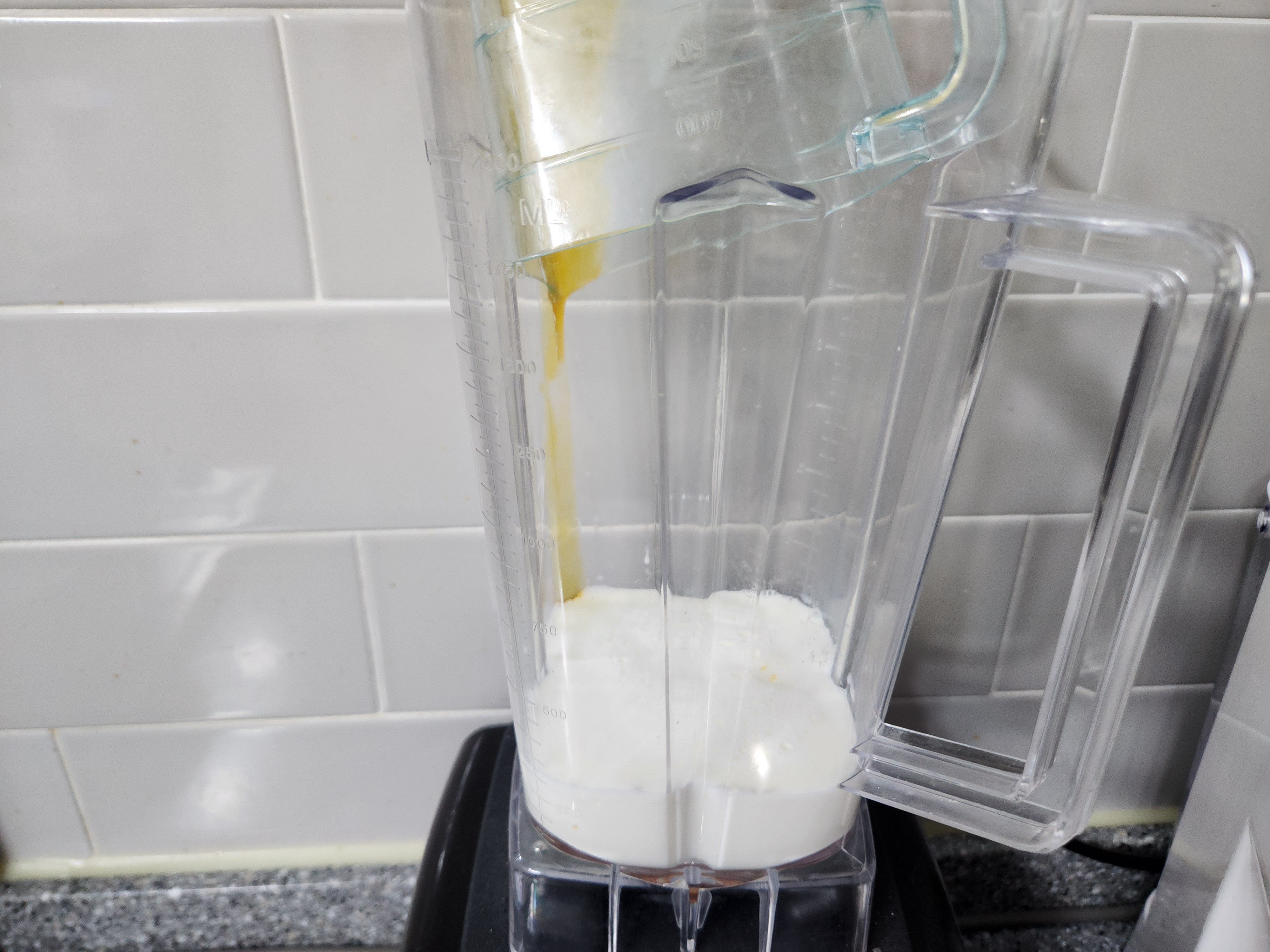 냉동망고스무디 만드는법으로 먼저 우유를 준비해줍니다. 2명이 먹을 분량으로 준비하겠습니다. 우유는 약 300미리 정도 믹서기에 넣어줍니다.