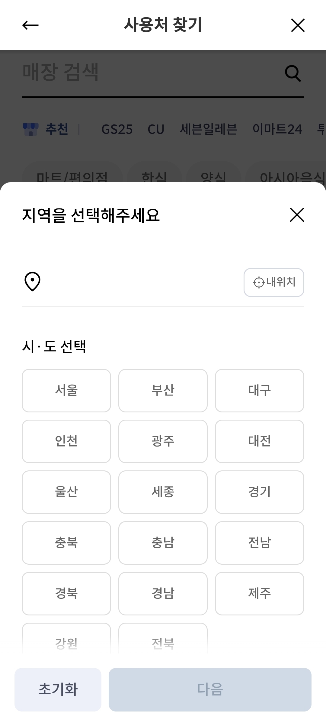 지역을 선택해서 사용가능한 매장을 찾을 수도 있어요.