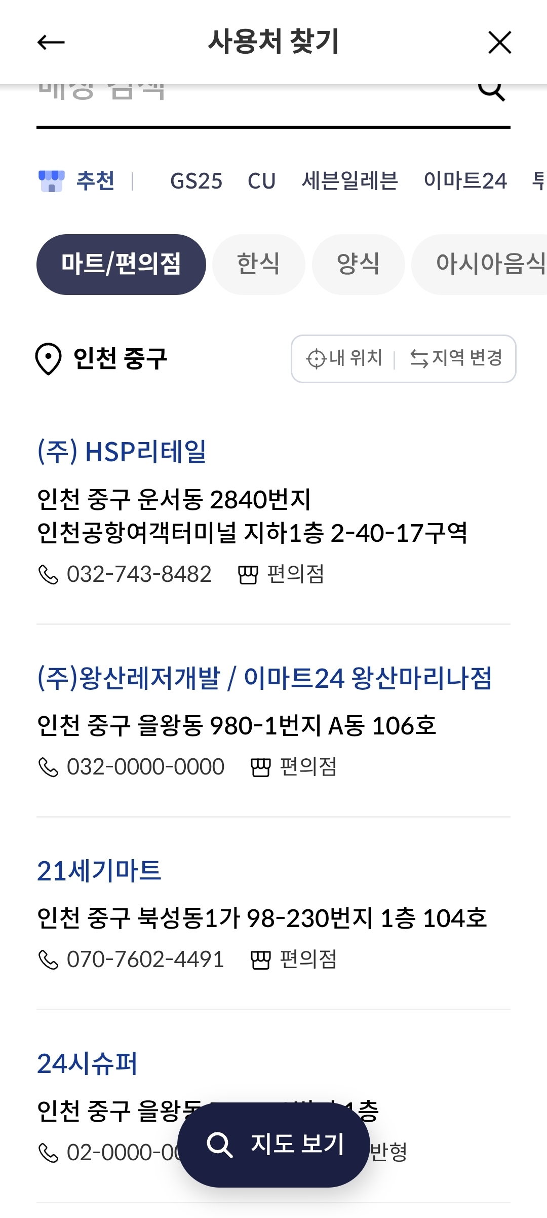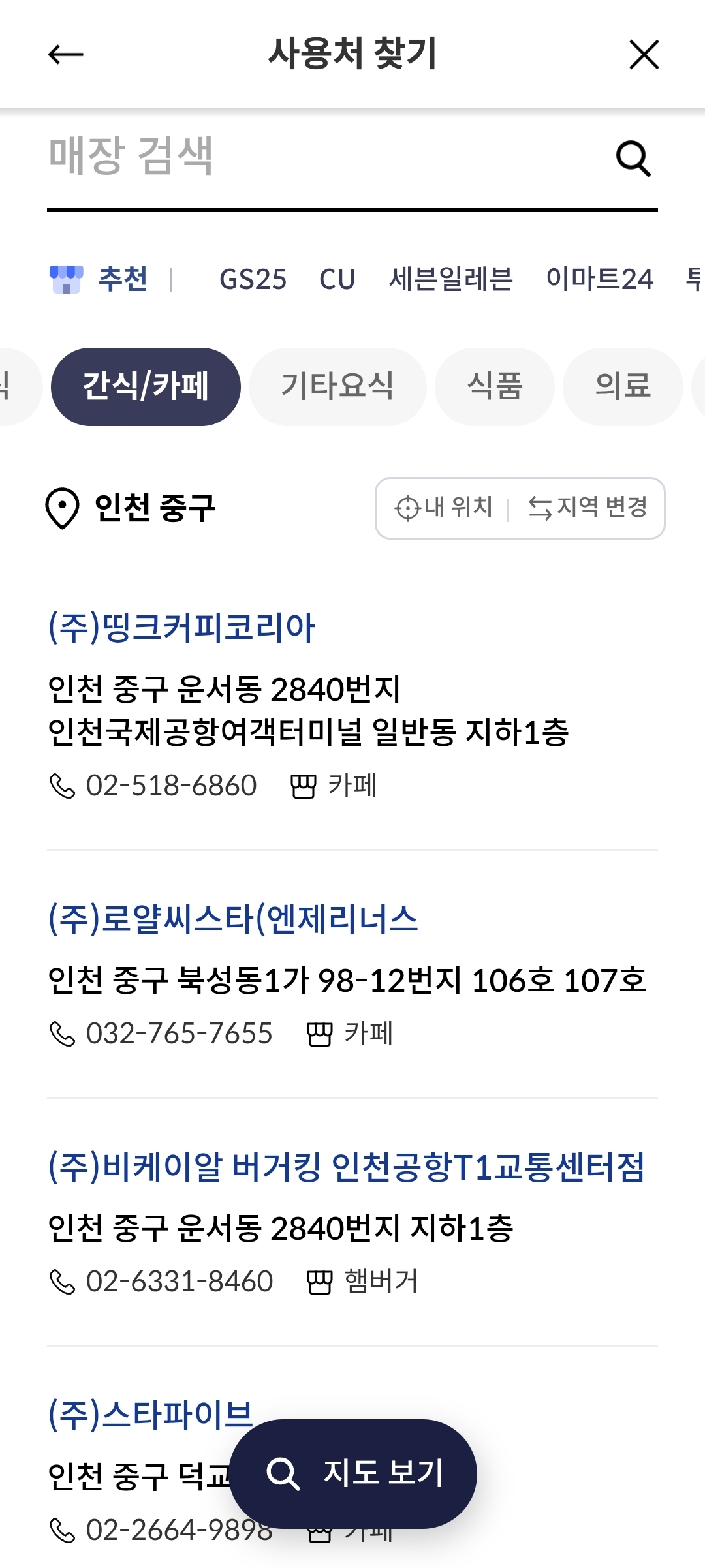 하단에 지도보기를 클릭하시면, 내 현재 위치 기준으로 사용가능한 매장을 찾아볼 수도 있습니다.