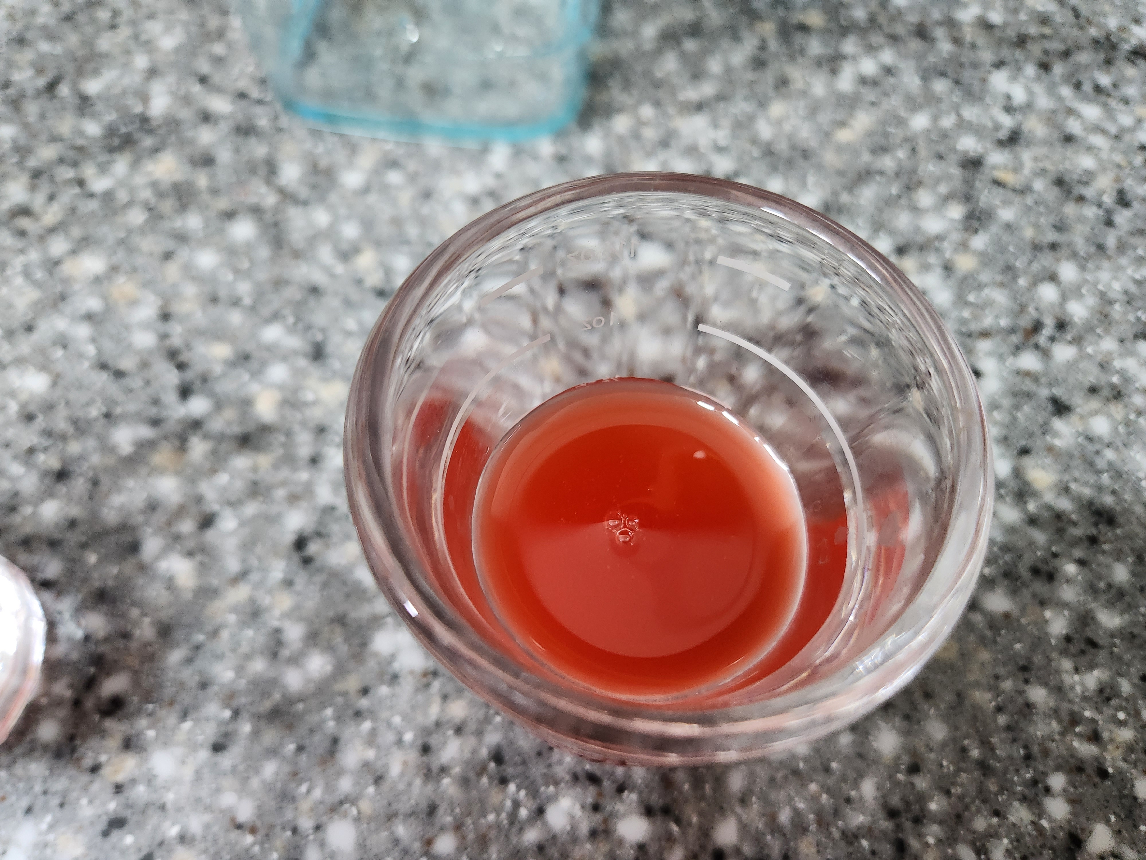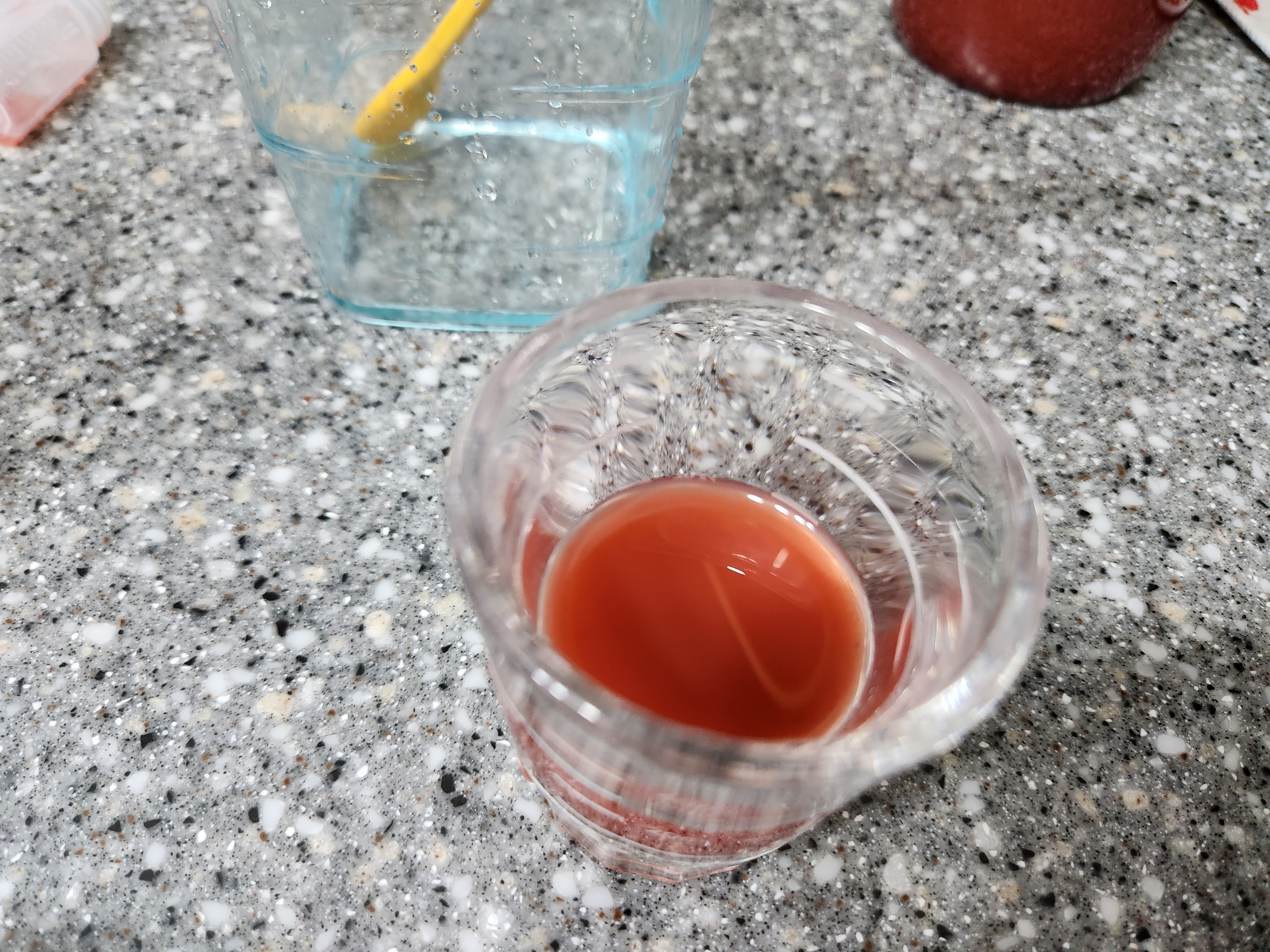 두 제품의 배합에 차이가 살짝 있습니다. 1 : 3, 1 : 4 그래서 일단은 기재되어 있는 음용법대로 따라해 봅니다. 참존딸기7베이스에 20미리로 기재되어 있어서, 저도 20미리로 해봤습니다. 왼쪽은 참존딸기7베이스 1 : 4 비율로 만들어 봤습니다. 탄산수를 이용하여 거품이 좀 있습니다. 오른쪽은 청송딸기농축액으로 1 : 3 비율입니다. 역시나 보이는 색은 청송딸기7베이스가 더 맑은 느낌이 납니다. 아무리 계속봐도 참존은 딸기잼 느낌입니다.