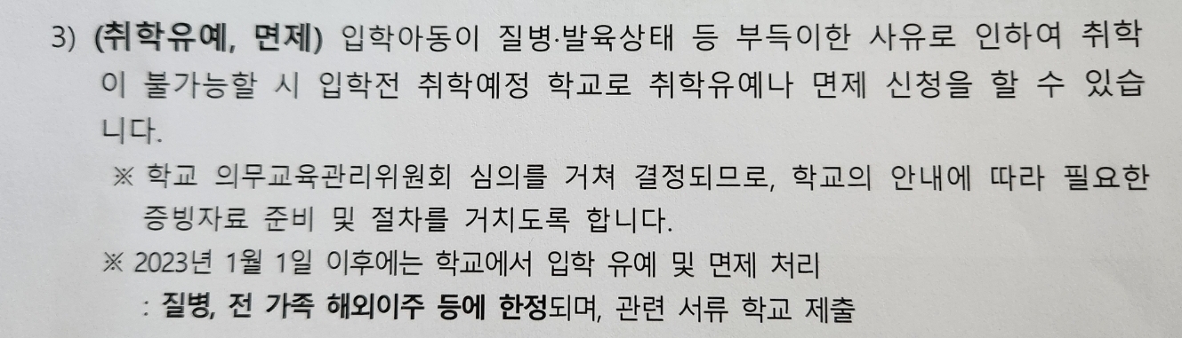 2023년 1월 1일 이후에 신청 - 취학유예, 면제 - 입학 예정 학교에 문의후 관련 서류 제출 - 질병, 전 가족 해외이주 등 신청 사유가 있어야 하며, 관련 서류 제출 후 심의를 거쳐 결정됨.