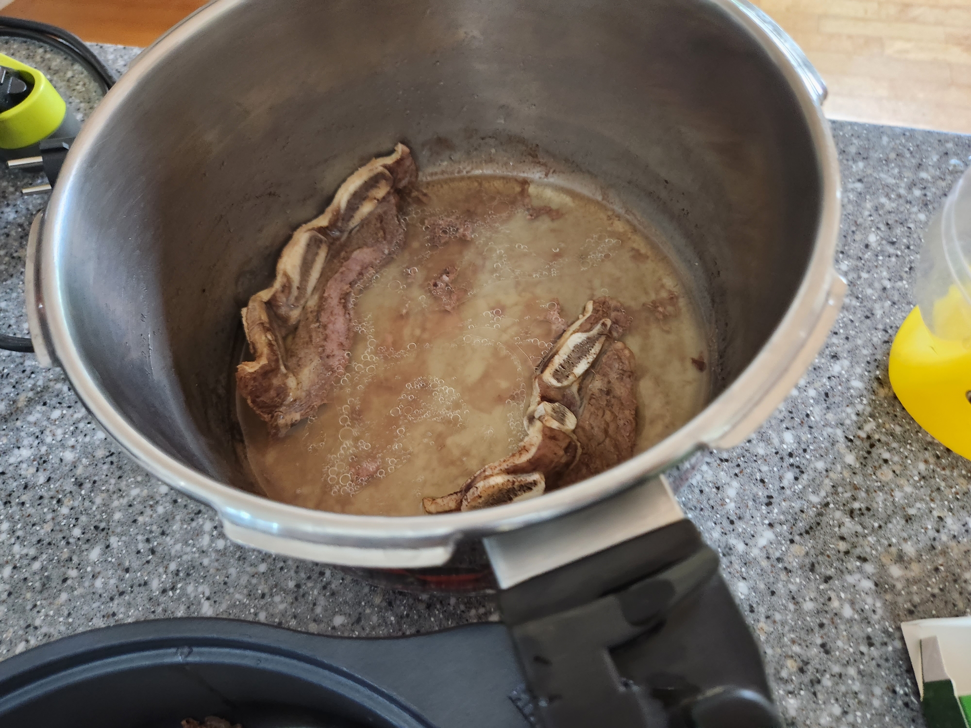 갈비를 압력밥솥에 넣고, 물은 100미리 정도 넣고, 뚜껑을 덮어주세요.