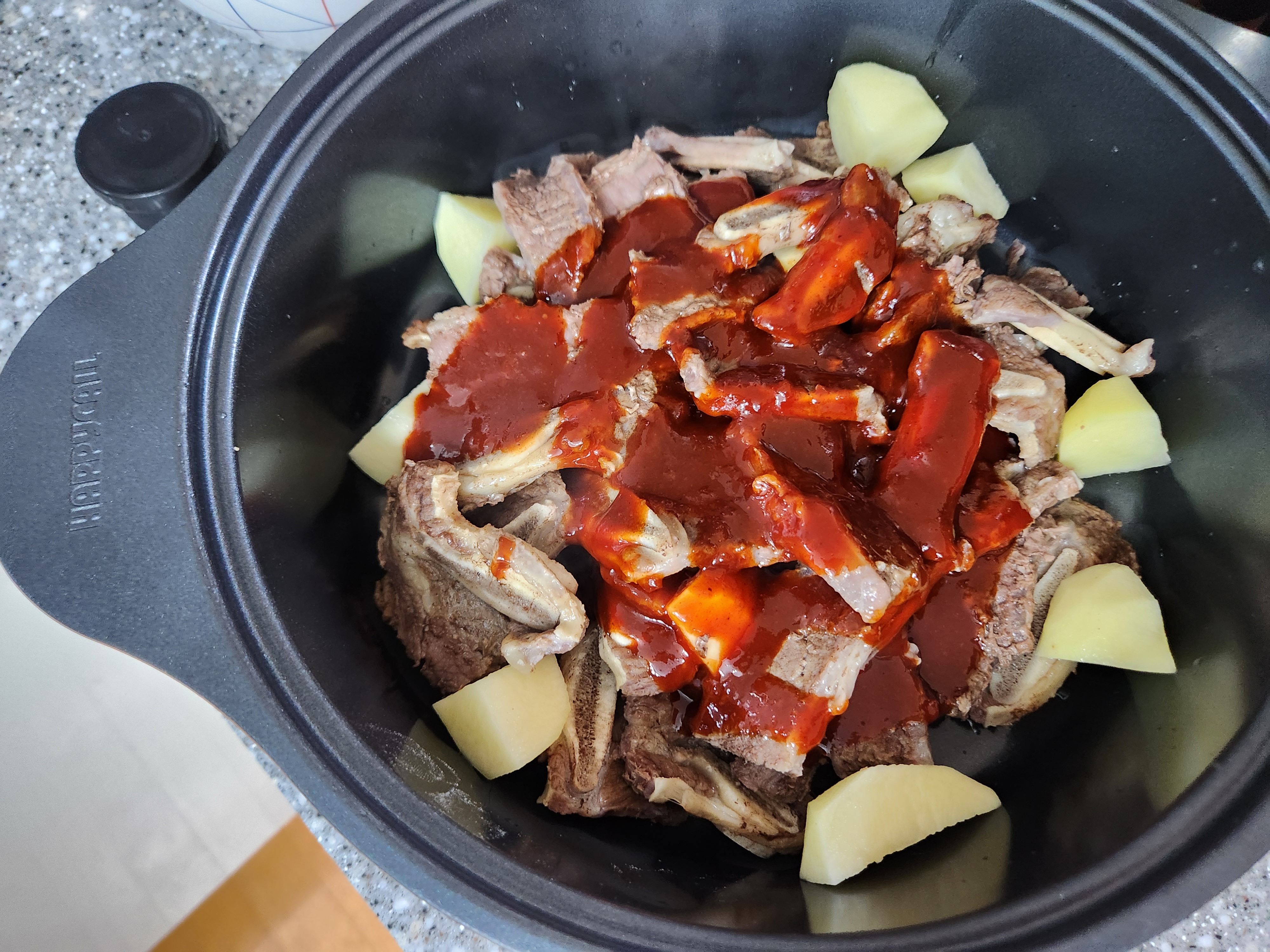 매운갈비양념을 부은 냄비에