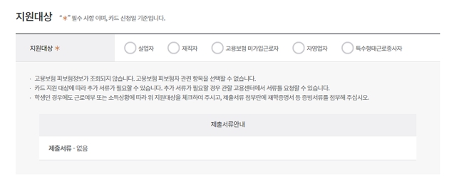 개인 정보 입력, 실물카드 정보를 입력, 지원대상, 첨부서류 첨부함.